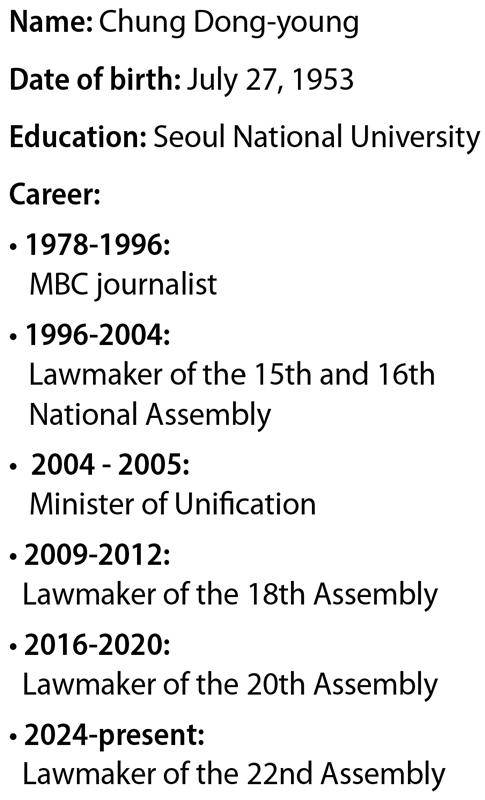Chung is an expert in inter-Korean affairs, having previously served as unification minister during the Roh Moo-hyun administration from 2004 to 2005. He also doubled as chairman of the National Security Council.