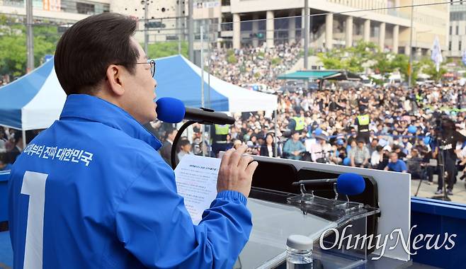| ▲ 이재명 더불어민주당 대선 후보가 31일 세종시 나무그늘광장에서 유권자들에게 지지를 호소하고 있다. |