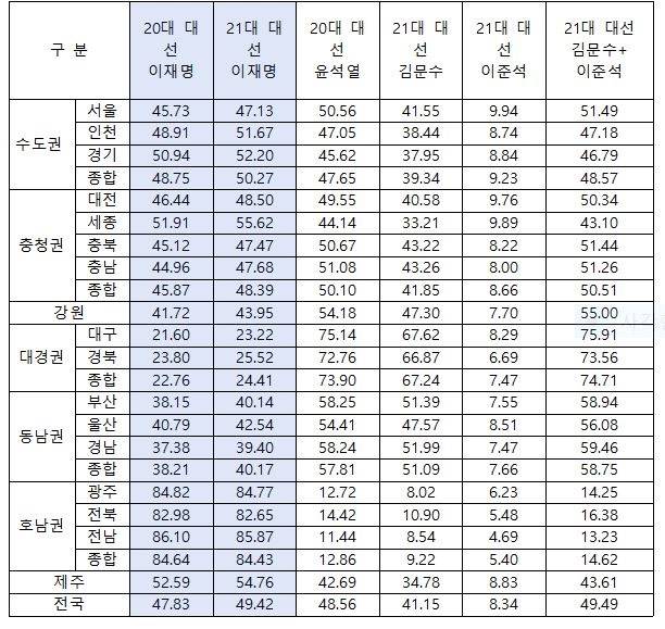 | ▲ <표 1> 20대·21대 대선의 각 후보의 지역별 득표율 (단위 : %) 출처:중앙선거관리위원회 선거 통계와 21대 대선 출구조사 |