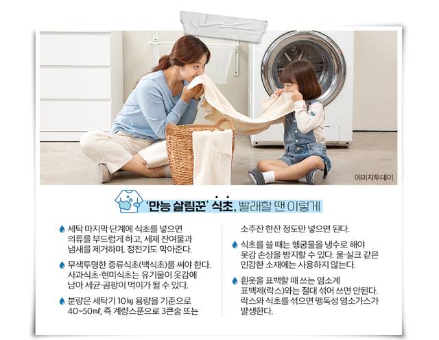 고온 세탁이 어려운 소재는 마지막 헹굼물에 식초를 3큰술 정도 넣어주면 냄새 발생을 막을 수 있다. 냄새를 잡겠다고 섬유유연제를 너무 많이 쓰면 잔여물이 세탁기 내부에 쌓여 악취 원인이 되고 옷감도 빨리 상하게 만든다.