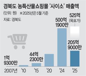 ◇매출액 가파른 신장세= 3일 경북도에 따르면 2007년 사이소 설립 당시 매출액은 1억9300만 원에 그쳤으나 2010년 16억4600만 원, 2015년 44억2300만 원, 2024년 500억1900만 원으로 이 기간 259배나 폭증했다. 회원 수도 2007년 2487명에서 2010년 4만3043명, 2020년 3만4018명, 2024년 24만498명으로 같은 기간 97배나 늘었다. 덩달아 입점 농가도 2007년 796농가에서 2020년 1073농가, 2024년 2517농가로 같은 기간 3배나 늘었다.