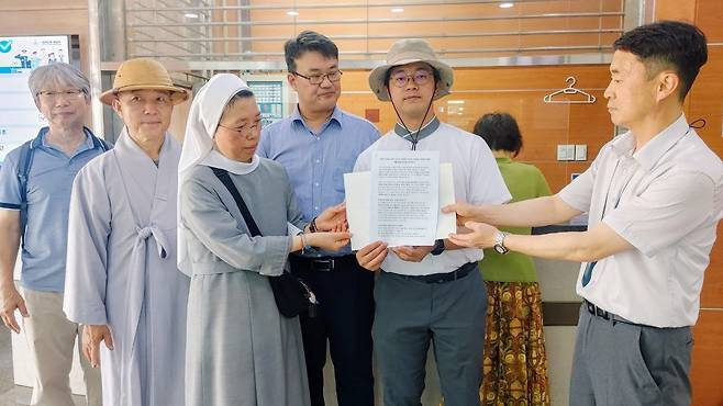| ▲ 오늘 모인 이들이 가덕도신공항 백지화 요구가 담긴 성명서를 대통령실에 전달하고 있다. |