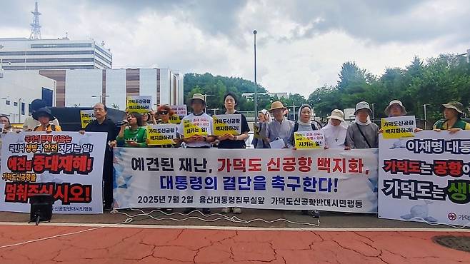 가덕도신공항반대시민행동과 가덕도신공항백지화촉구농성장을지키는사람들이 2일 오후 2시 용산 대통령 집무실 앞 농성장 발족식을 열었다. 이날 이들은 대통령실에 가덕도신공항 백지화를 요구하는 서한을 전달하기도 했다.