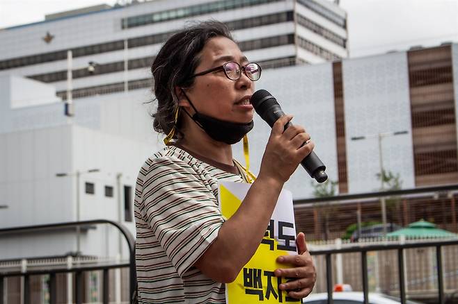 | ▲ 부산에서 온 김현욱 가덕도신공항반대시민행동 집행위원이 발언을 하고 있다. |