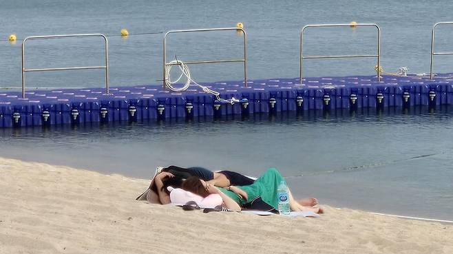 ▲ 초열대야를 피해 3일 새벽 경포해변으로 나와 잠을 자는 부부
