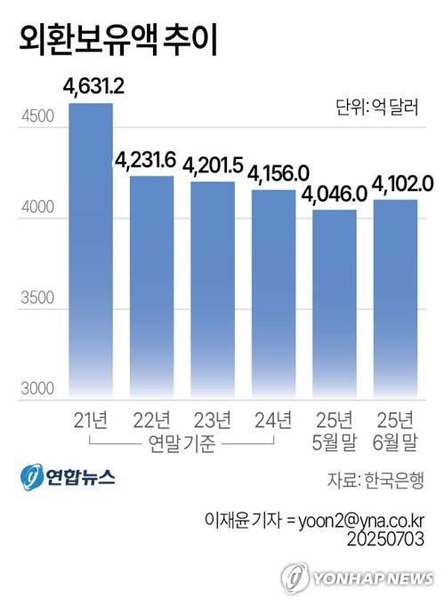 (서울=연합뉴스) 이재윤 기자 = 한국은행이 3일 발표한 외환보유액 통계에 따르면 6월 말 기준 우리나라 외환보유액은 4천102억달러(약 557조원)로, 전월보다 56억1천만달러 늘었다.