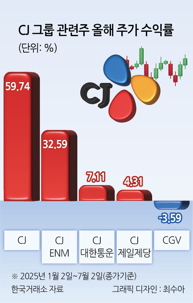 3일 한국거래소에 따르면 ▷CJ(59.74%) ▷CJ ENM(32.59%) ▷CJ 대한통운(7.11%) ▷CJ 제일제당(4.31%) 순으로 올해 CJ 그룹 관련 주가는 대부분 오름세다.