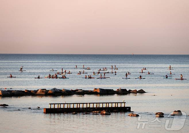 (바로셀로나 로이터=뉴스1) 양은하 기자 = 2일 스페인 바르셀로나 해변에서 관광객과 현지인들이 패들보드를 타고 있다. 2025.07.02.