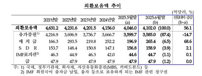 외환보유액 6월 기준 4,102억 달러…달러 약세 영향 56억 달러 증가