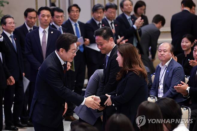 (서울=연합뉴스) 한상균 기자 = 이재명 대통령이 3일 청와대 영빈관에서 열린 '대통령의 30일, 언론이 묻고 국민에게 답하다' 기자회견에 입장하며 취재진과 인사하고 있다. 2025.7.3 [대통령실통신사진기자단]