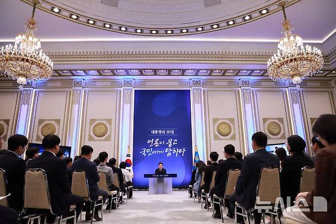 [서울=뉴시스] 고범준 기자 = 이재명 대통령이 3일 청와대 영빈관에서 열린 '대통령의 30일, 언론이 묻고 국민에게 답하다' 기자회견에서 발언하고 있다. (대통령실통신사진기자단) 2025.07.03. bjko@newsis.com