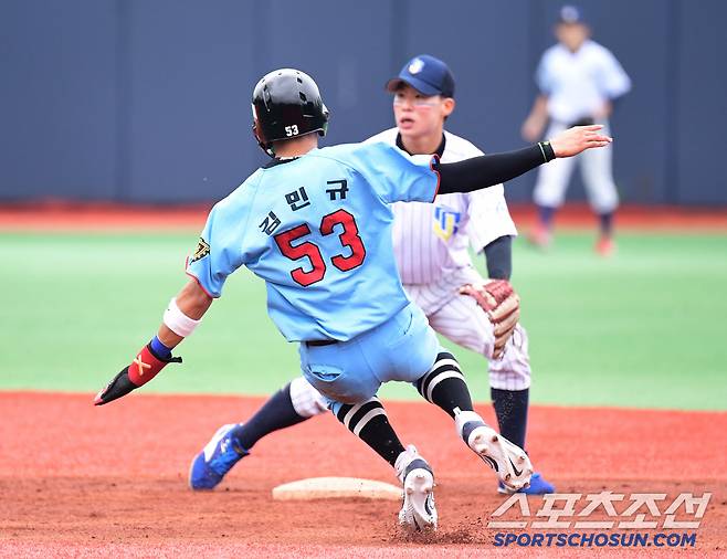 3일 서울 신월구장에서 열린 제80회 청룡기 고교야구선수권 대회 및 주말리그 왕중왕전 휘문고-전북인공지능고 경기. 2회 2루 도루 성공시키는 휘문고 김민규. 신월동=송정헌 기자songs@sportschosun.com/2025.07.03/