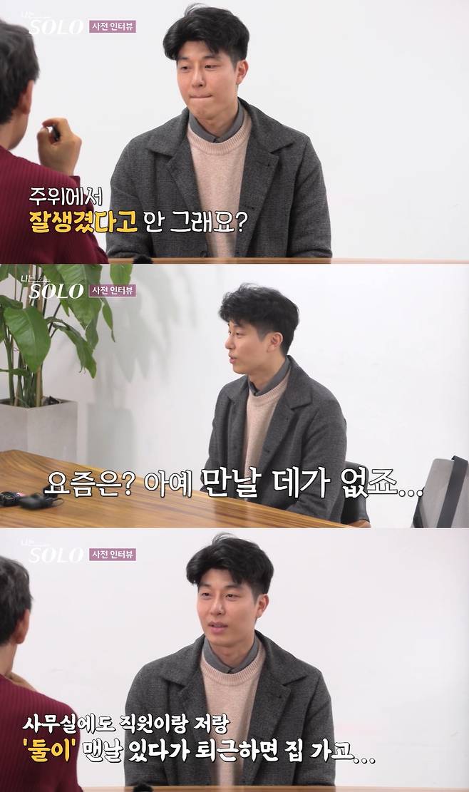 27기 영수는 "주변에서 잘생겼다고 안 하냐"는 질문에 "그것도 한 8~9년 전 얘기다. 옛날얘기"라며 "요즘은 아예 만날 데가 없다. 사무실에도 직원이랑 저랑 둘이 맨날 있다가 퇴근하면 집 가고"라고 답했다.