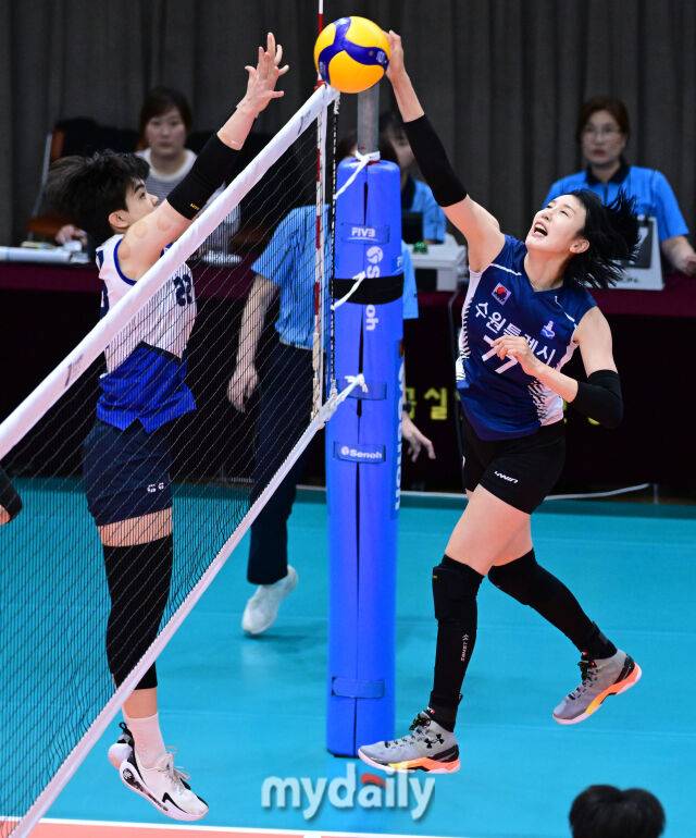 수원특례시청 김나희가 스파이크를 강타하고 있다.