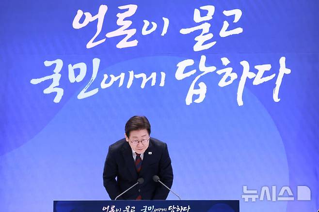 [서울=뉴시스] 고범준 기자 = 이재명 대통령이 3일 청와대 영빈관에서 열린 '대통령의 30일, 언론이 묻고 국민에게 답하다' 기자회견에서 인사를 하고 있다. (대통령실통신사진기자단) 2025.07.03. bjko@newsis.com