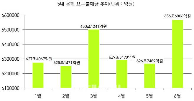 3일 5대 은행(KB국민·신한·우리·하나·NH농협)에 따르면 수시입출금식 저축성예금(MMDA)을 포함한 요구불예금은 6월 말 기준 656조 6806억원으로 집계됐다.