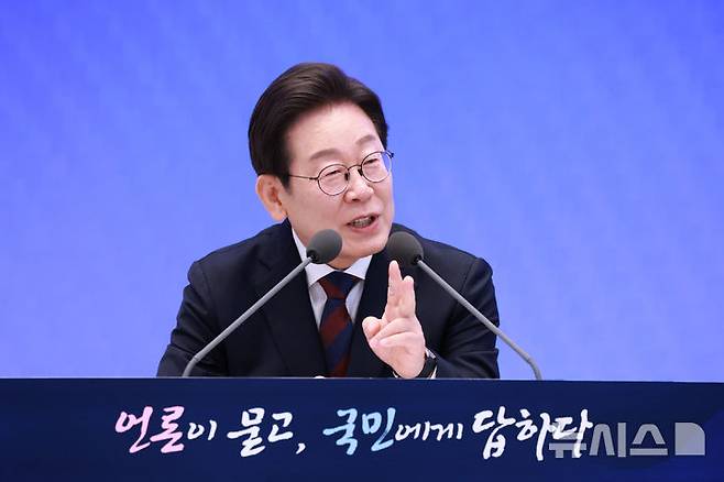 [서울=뉴시스] 고범준 기자 = 이재명 대통령이 3일 청와대 영빈관에서 열린 '대통령의 30일, 언론이 묻고 국민에게 답하다' 기자회견에서 출입기자 질문에 답변하고 있다. (대통령실통신사진기자단) 2025.07.03. bjko@newsis.com