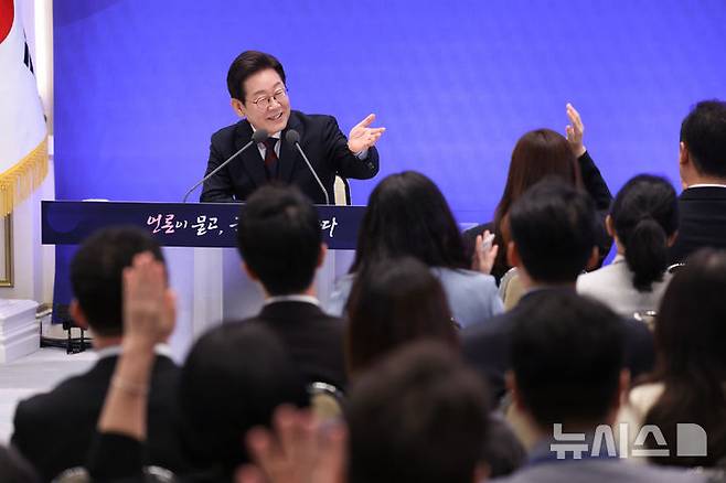 [서울=뉴시스] 고범준 기자 = 이재명 대통령이 3일 청와대 영빈관에서 열린 '대통령의 30일, 언론이 묻고 국민에게 답하다' 기자회견에서 출입기자 질문을 받고 있다. (대통령실통신사진기자단) 2025.07.03. bjko@newsis.com