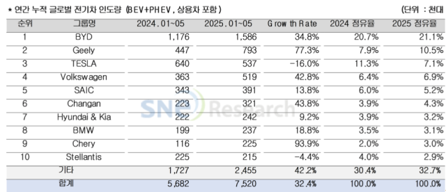 중국 업체들이 상위권을 차지했다. 중국 BYD는 전년 동기 대비 34.8% 늘어난 약 158만 6000대의 전기차를 판매하며 1위를 유지했다. 시장 점유율은 21.1%다.
