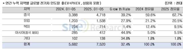 한편 2025년 1~5월 글로벌 전기차 시장은 지역별로 상이한 흐름을 보이며 각국의 정책 환경과 수요 구조에 따라 성장 양상이 뚜렷하게 갈리고 있다.