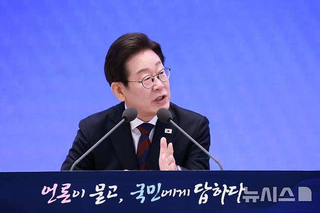 [서울=뉴시스] 고범준 기자 = 이재명 대통령이 3일 청와대 영빈관에서 열린 '대통령의 30일, 언론이 묻고 국민에게 답하다' 기자회견에서 출입기자 질문에 답변하고 있다. (대통령실통신사진기자단) 2025.07.03. bjko@newsis.com