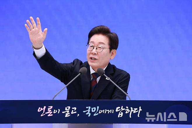 [서울=뉴시스] 고범준 기자 = 이재명 대통령이 3일 청와대 영빈관에서 열린 '대통령의 30일, 언론이 묻고 국민에게 답하다' 기자회견에서 손을 들고 있다. (대통령실통신사진기자단) 2025.07.03. bjko@newsis.com