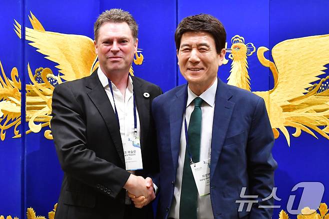 (포항=뉴스1) 최창호 기자 = 이강덕 경북 포항시장이 3일 오전 북구 라한호텔에서 열린 UN GIH S.I.W(UN GIH 시스테믹혁신워크숍)에 앞서 마크 머슬린 영국 유니버시티 칼리지 런던 지구시스템학과 교수와 환담하고 있다.