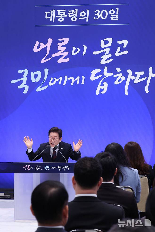 [서울=뉴시스] 고범준 기자 = 이재명 대통령이 3일 청와대 영빈관에서 열린 '대통령의 30일, 언론이 묻고 국민에게 답하다' 기자회견에서 출입기자 질문에 답변하고 있다. (대통령실통신사진기자단) 2025.07.03. bjko@newsis.com