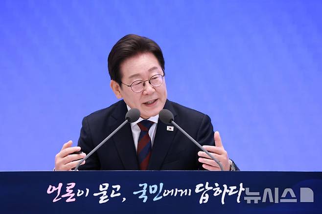 [서울=뉴시스] 고범준 기자 = 이재명 대통령이 3일 청와대 영빈관에서 열린 '대통령의 30일, 언론이 묻고 국민에게 답하다' 기자회견에서 출입기자 질문에 답변하고 있다. (대통령실통신사진기자단) 2025.07.03. bjko@newsis.com