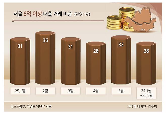 이들 중 6억원 이상 대출을 받은 이의 비중은 올해 들어 소폭 증가했다. 2024년까지는 1년 내내 20%대를 유지하다, 지난 12월 31%로 소폭 증가했다. 토지거래허가구역(토허구역)이 일시적으로 해제됐던 2월 35%로 뛰더니, 지난 5월에는 33%로 내려앉았다. 스트레스 총부채원리금상환비율(DSR)이 지난해부터 점진적으로 시행되고, 금융권의 금리 인하가 아직 본격화되지 않아 일반적으론 거액의 대출을 받기는 어려웠기 때문으로 풀이된다.