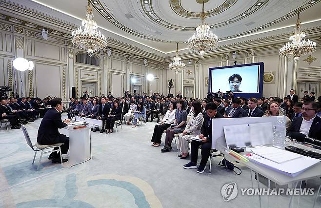(서울=연합뉴스) 한상균 기자 = 3일 청와대 영빈관에서 열린 이재명 대통령의 '대통령의 30일, 언론이 묻고 국민에게 답하다' 기자회견에서 화상 연결로 지역 언론사 기자가 질문하는 모습이 스크린에 보이고 있다. 2025.7.3 [대통령실통신사진기자단]