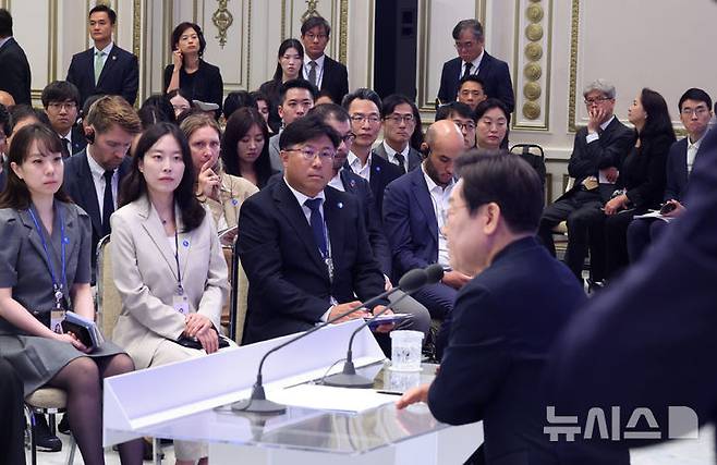 [서울=뉴시스] 고범준 기자 = 3일 청와대 영빈관에서 열린 '대통령의 30일, 언론이 묻고 국민에게 답하다' 기자회견에서 취재진들이 이재명 대통령의 답변을 듣고 있다. (대통령실통신사진기자단) 2025.07.03. bjko@newsis.com