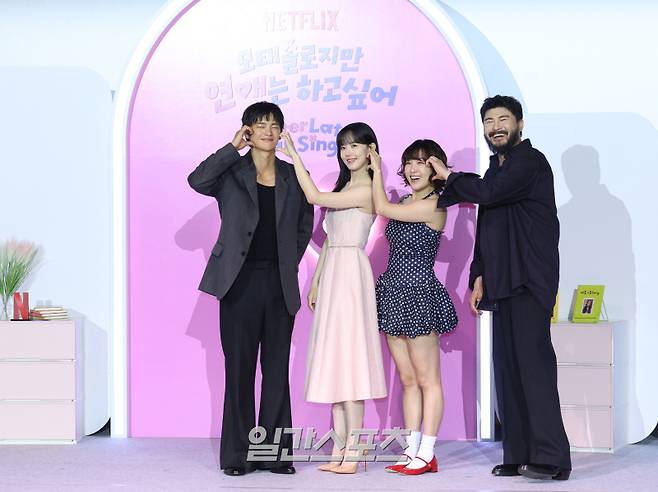 배우 서인국, 강한나, 코미디언 이은지, 가수 카더가든이 3일 오전 서울 용산구 CGV용산아이파크몰에서 열린 넷플릭스 예능 '모태솔로지만 연애는 하고 싶어' 제작발표회에 참석해 포즈를 취하고 있다.
