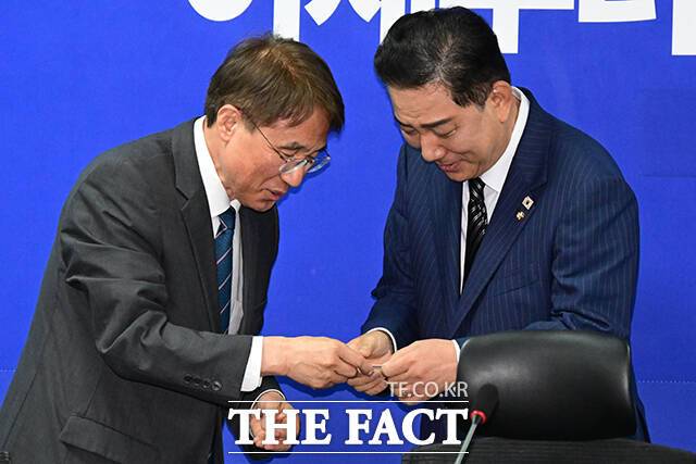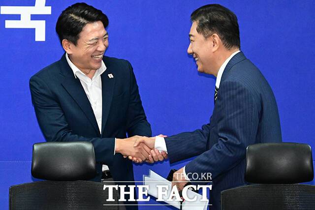 [더팩트ㅣ국회=남윤호 기자] 김병기 더불어민주당 대표 직무대행 겸 원내대표가 3일 오전 서울 여의도 국회 의원회관에서 열린 '더불어민주당 국방위원·국정기획위' 간담회에 참석해 홍현익 국정기획위원회 외교안보분과위원장과 인사하고 있다.