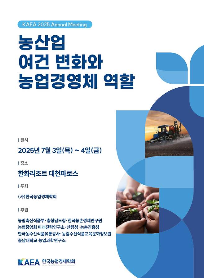한국농업경제학회는 3~4일 충남 보령시 대천 한화리조트에서 '농산업 여건 변화와 농업경영체 역할'이라는 주제로 '2025 하계 학술대회'를 진행한다.