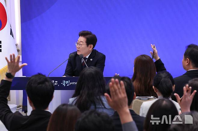 [서울=뉴시스] 고범준 기자 = 이재명 대통령이 3일 청와대 영빈관에서 열린 '대통령의 30일, 언론이 묻고 국민에게 답하다' 기자회견에서 출입기자 질문에 답변하고 있다. (대통령실통신사진기자단) 2025.07.03. bjko@newsis.com