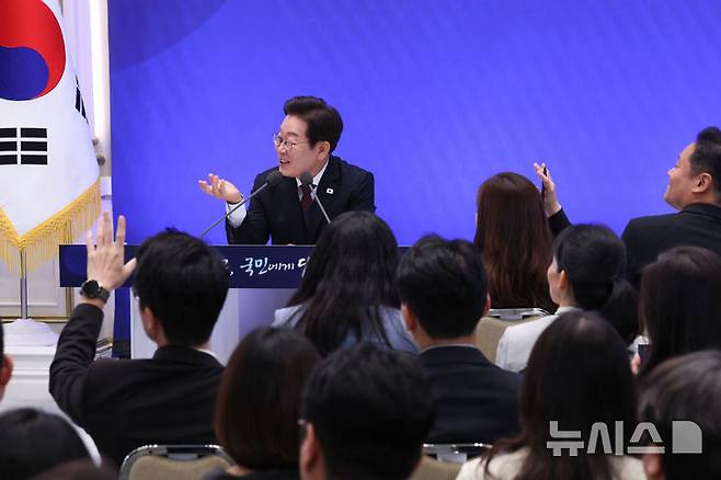[서울=뉴시스] 고범준 기자 = 이재명 대통령이 3일 청와대 영빈관에서 열린 '대통령의 30일, 언론이 묻고 국민에게 답하다' 기자회견에서 출입기자 질문에 답변하고 있다. (대통령실통신사진기자단) 2025.07.03. bjko@newsis.com