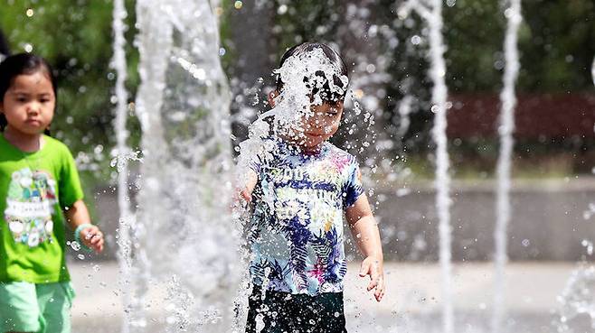 ▲ 2일 광주 북구 신용근린공원 바닥분수광장에서 아이들이 물놀이를 즐기고 있다.
