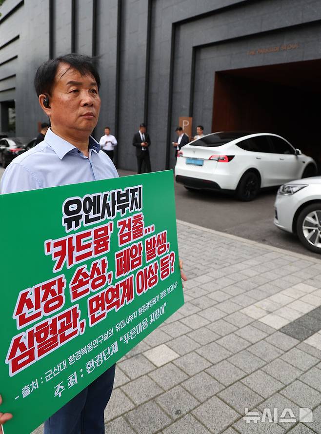 [서울=뉴시스] 최진석 기자 = 3일 서울 강남구 더파크사이드 서울 갤러리 앞에서 환경단체 푸른마을 지킴이 회원이 유엔사부지 환경오염 관련 피켓을 들고 있다. 2025.07.03. myjs@newsis.com