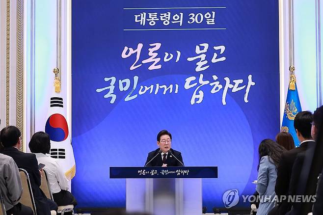(서울=연합뉴스) 한상균 기자 = 이재명 대통령이 3일 청와대 영빈관에서 '대통령의 30일, 언론이 묻고 국민에게 답하다' 기자회견을 하고 있다. 2025.7.3 [대통령실통신사진기자단]