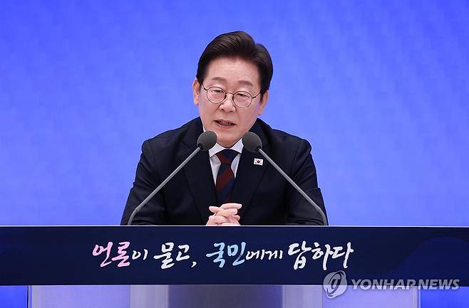 (서울=연합뉴스) 한상균 기자 = 이재명 대통령이 3일 청와대 영빈관에서 '대통령의 30일, 언론이 묻고 국민에게 답하다' 기자회견을 하고 있다. 2025.7.3 [대통령실통신사진기자단]