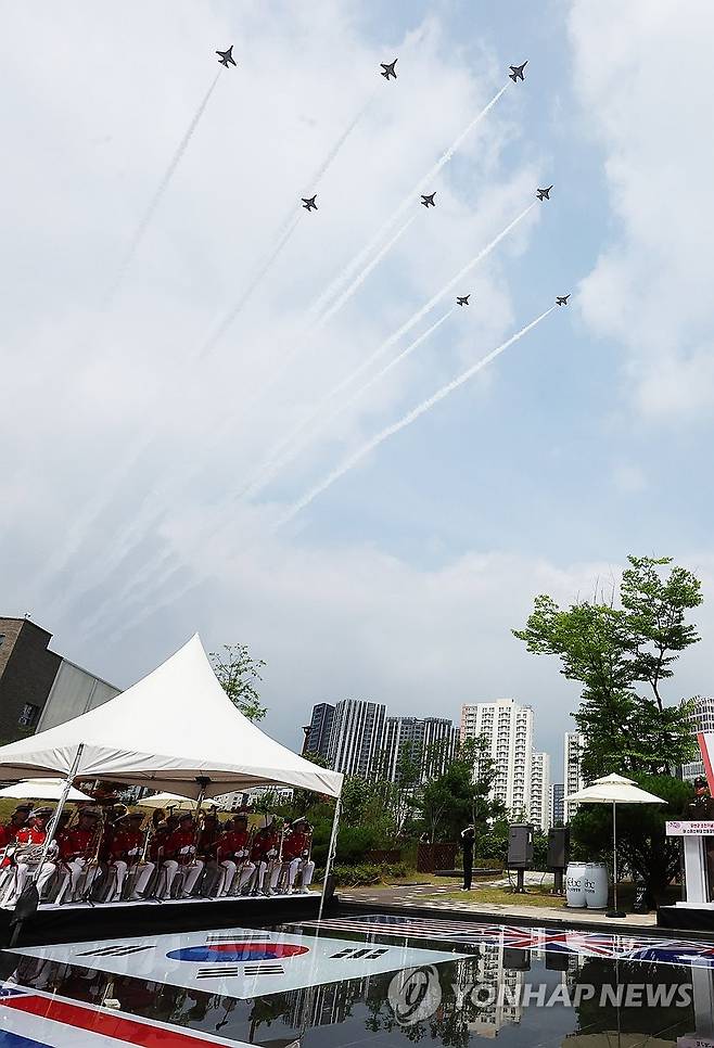 (오산=연합뉴스) 홍기원 기자 = 3일 경기도 오산시 죽미령 평화공원에서 열린 '제75주년 유엔군 초전기념 및 미 스미스부대 전몰장병 추도식'에서 공군 특수비행팀 블랙이글스가 추모비행을 하고 있다. 2025.7.3
