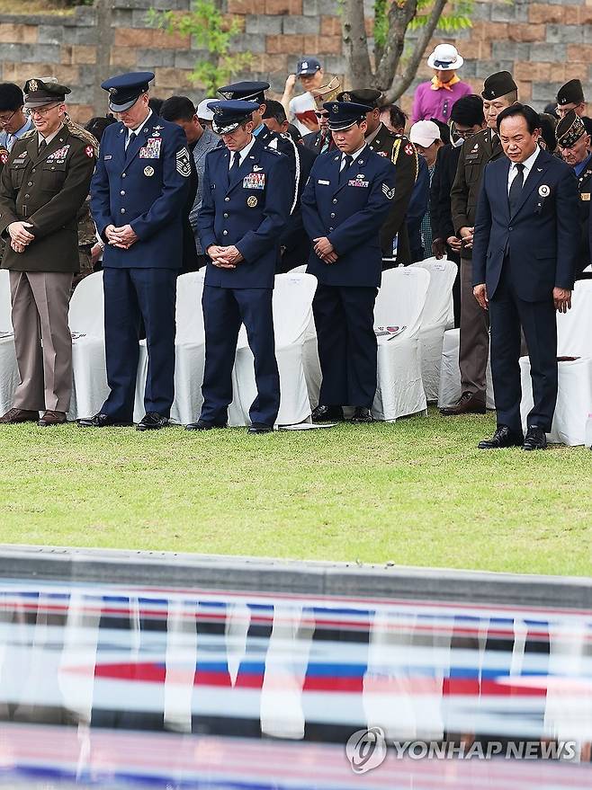 (오산=연합뉴스) 홍기원 기자 = 3일 경기도 오산시 죽미령 평화공원에서 열린 '제75주년 유엔군 초전기념 및 미 스미스부대 전몰장병 추도식'에서 참석자들이 묵념하고 있다. 2025.7.3