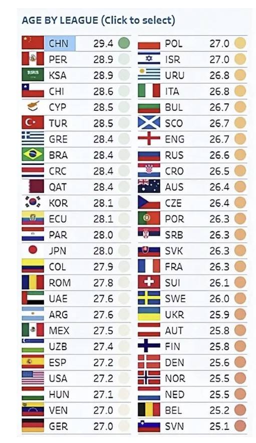 중국의 소후닷컴은 3일(한국시각) '중국슈퍼리그는 평균 연령 29.4세로 1위를 차지했다'라고 보도했다.