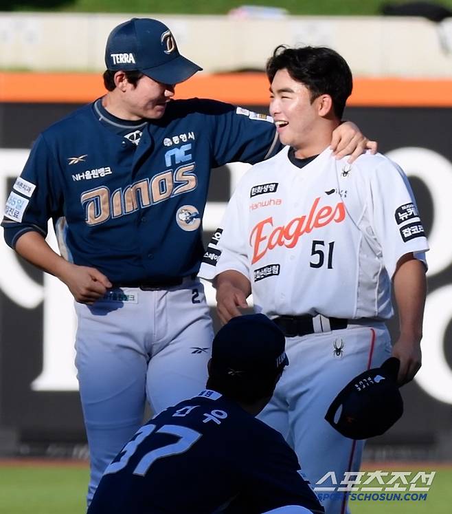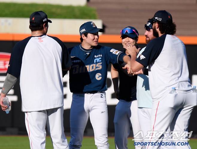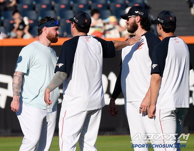 류현진과 손아섭이 제법 진지한 대화를 시작한 후에도, 유머 넘치는 박민우와 폰세의 티키타카는 계속 이어졌다. 오후 6시, 대전 신구장에는 항상 웃음꽃이 핀다.
