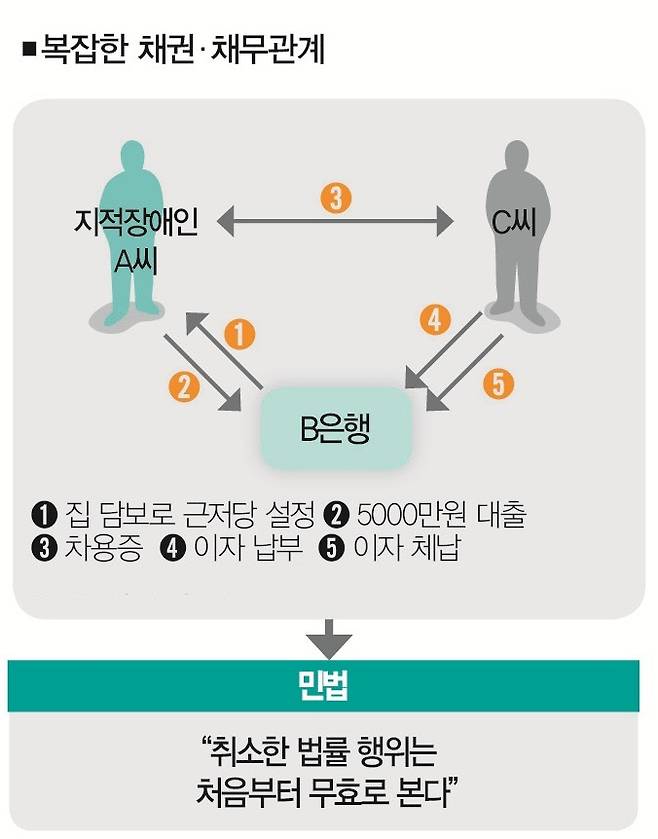 A씨는 대출거래 약정, 근저당권 설정의 법률적 의미와 책임을 합리적으로 판단할 수 있는 정신적 능력이 없었다. 이에 따라 대출거래약정과 근저당권 설정계약은 의사능력이 없는 상태에서 체결된 것으로 무효다. 계약이 무효면 법률효과가 발생하지 않는다. 이미 행위가 이뤄진 상태라면 법률상 원인이 없는 것으로 간주돼 부당이득이 된다. B은행으로선 근저당권설정등기를 말소해야 한다는 거다.