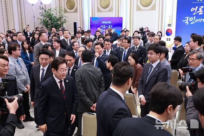 [서울=뉴시스] 고범준 기자 = 이재명 대통령이 3일 청와대 영빈관에서 열린 '대통령의 30일, 언론이 묻고 국민에게 답하다' 기자회견을 마친 뒤 기자회견장을 나서고 있다. (대통령실통신사진기자단) 2025.07.03. bjko@newsis.com