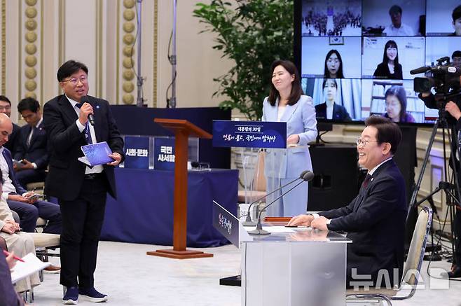 [서울=뉴시스] 고범준 기자 = 이재명 대통령이 3일 청와대 영빈관에서 열린 '대통령의 30일, 언론이 묻고 국민에게 답하다' 기자회견에서 출입기자의 질문을 듣고 있다. (대통령실통신사진기자단) 2025.07.03. bjko@newsis.com