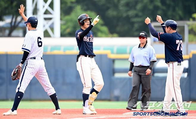 3일 서울 목동구장에서 열린 제80회 청룡기 고교야구선수권 대회 및 주말리그 왕중왕전, 성남고와 서울고의 경기, 1회초 성남고 안진표가 1타점 적시타를 치고 환호하고 있다. 목동=허상욱 기자wook@sportschosun.com/2025.07.03/
