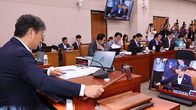 ▲ 3일 서울 여의도 국회에서 열린 법제사법위원회 전체회의에서 더불어민주당 소속 이춘석 위원장이 의사봉을 두드리고 있다.